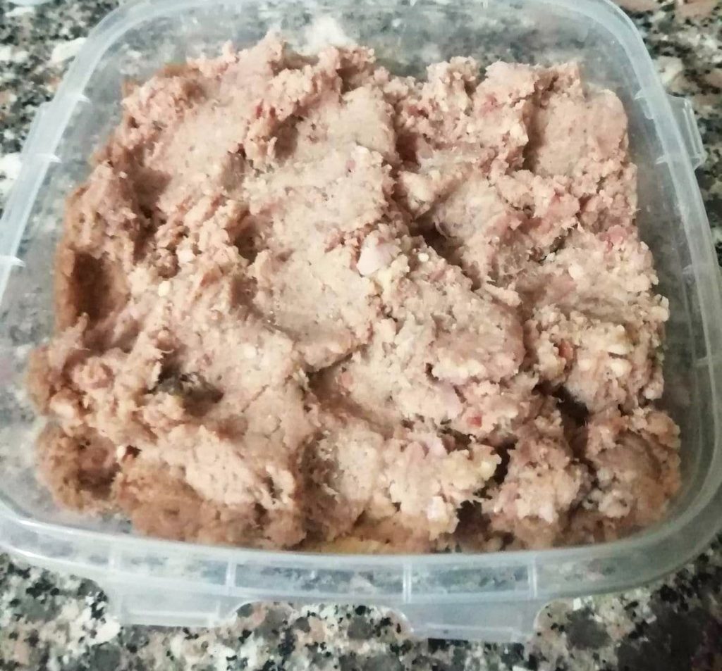 • Pon en una batidora o picadora la carne de cerdo, el jamón crudo dulce sin la grasa, la mortadela, el parmesano rallado, el huevo y una pizca de nuez moscada.
