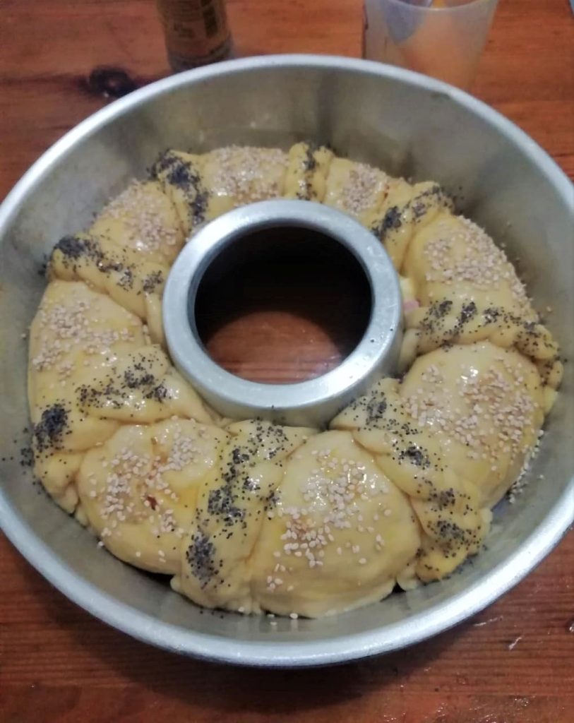 Pincelad la corona con la yema de huevo batida y luego decoradla con semillas de amapola en las trenzas y semillas de sésamo en las partes vacías. Esta última operación es opcional.