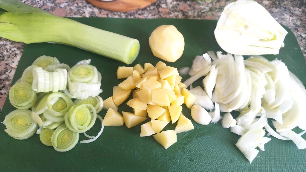 Lavad y limpiad los hinojos, cortadlos en rodajas finas. Lavad el puerro y cortadlo también en rodajas finas. Pelad las patatas y cortadlas en pequeños dados.