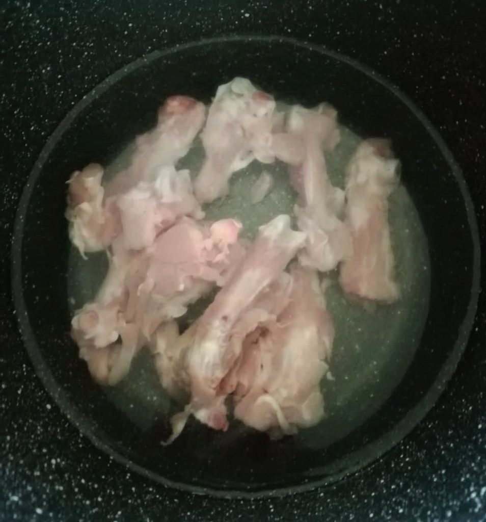 En un cazo vierta un litro de agua fría y coloca los huesos de los muslos. Cuece el caldo durante 30 minutos desde el inicio de la ebullición. No añadas sal al caldo.