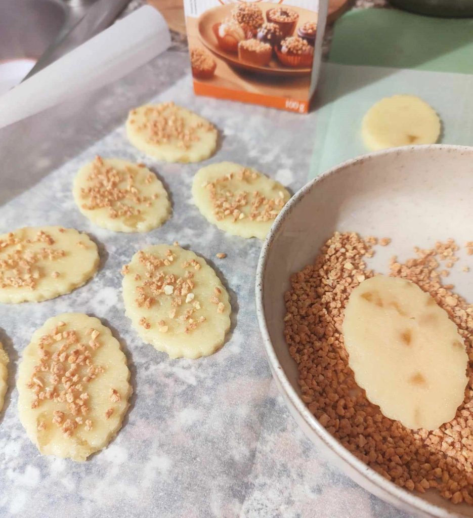 Coloca las galletas en la bandeja del horno o en la cesta de la freidora de aire, donde habrás puesto un trozo de papel de horno o una alfombrilla antiadherente para que no se peguen.