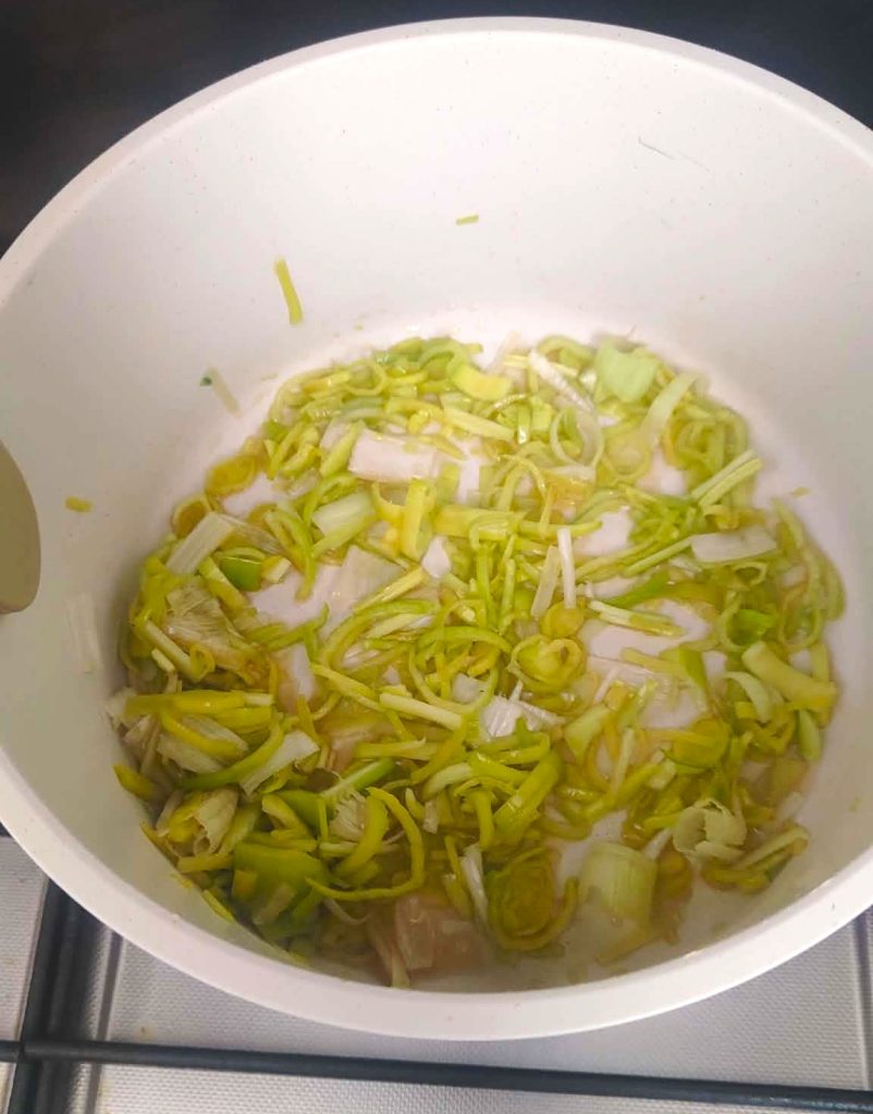 Pocha el puerro picado finamente 1–2 minutos sin dejar que se dore.