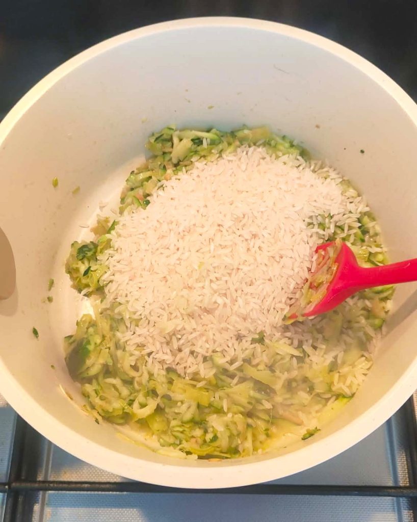 Incorpora el calabacín rallado o cortado en dados pequeños y el jengibre rallado.