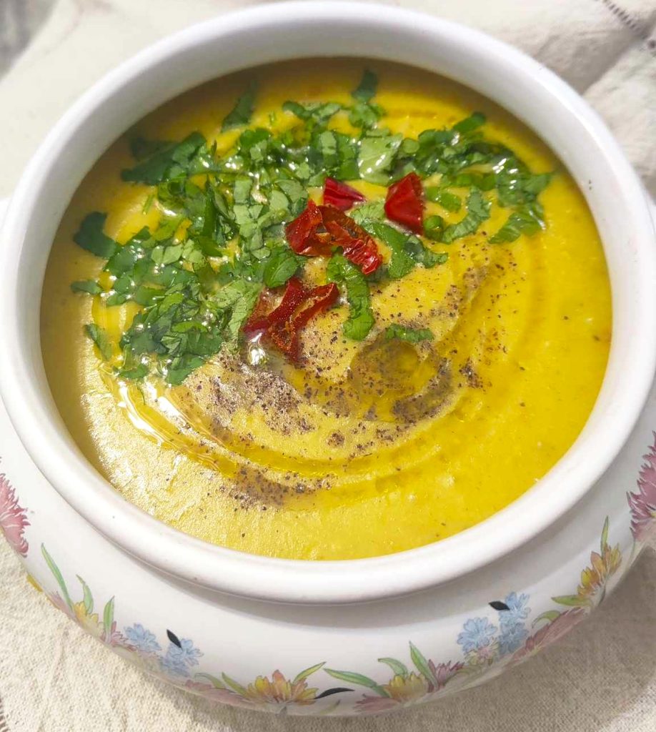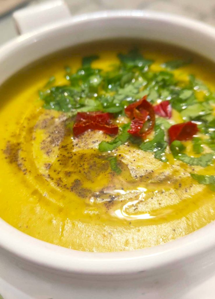 4 – Al final de la cocción, con una batidora de inmersión mezcla el compuesto, añade la crema de coco o la nata vegetal, mezcla bien, prueba y ajusta la sal si es necesario y emplata la golden cream.