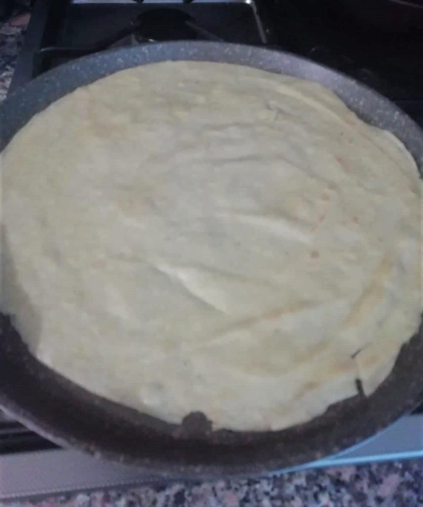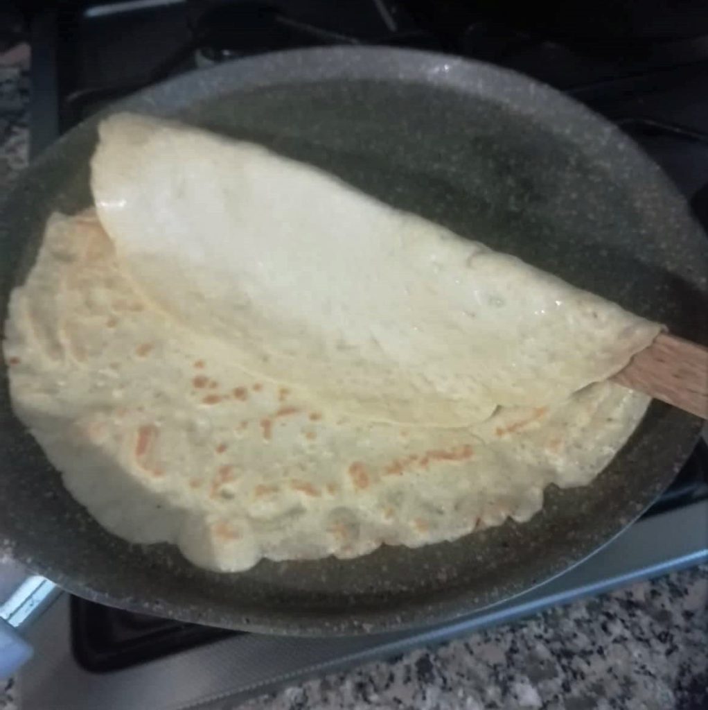 Después de 2 minutos, veréis los bordes cocidos y casi levantados, ayudándoos con una espátula de madera plana levantad toda la crepe y dadle la vuelta con delicadeza en la sartén, como si fuera una tortilla.
