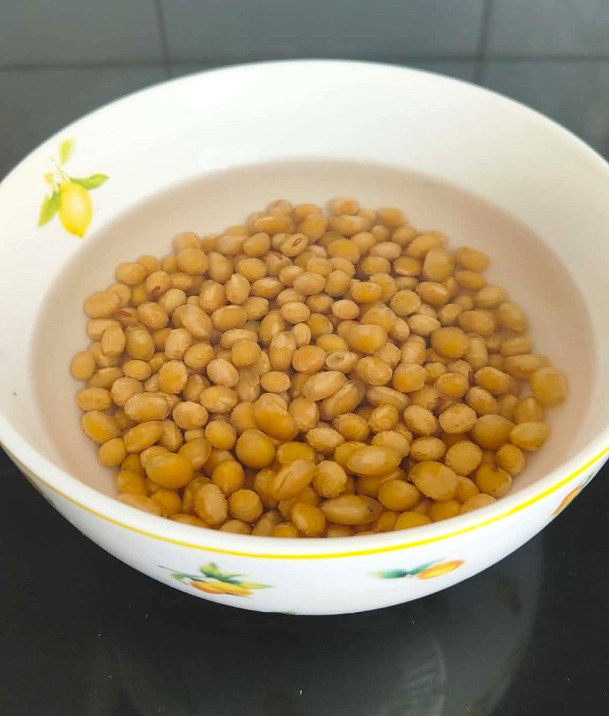 1 – Enjuaga los frijoles de soja secos varias veces bajo agua corriente. Luego ponlos en remojo para rehidratarlos en un bol lleno de agua. Cambia el agua con frecuencia durante las aproximadamente 4 horas de rehidratación.