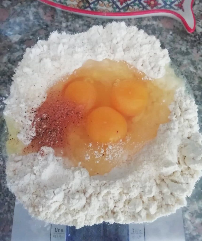 • Dispón la harina en una tabla en forma de volcán, o en un bol grande y añade en el centro los huevos, el parmesano, la nuez moscada y el aceite. A gusto, se puede añadir una pizca de sal.