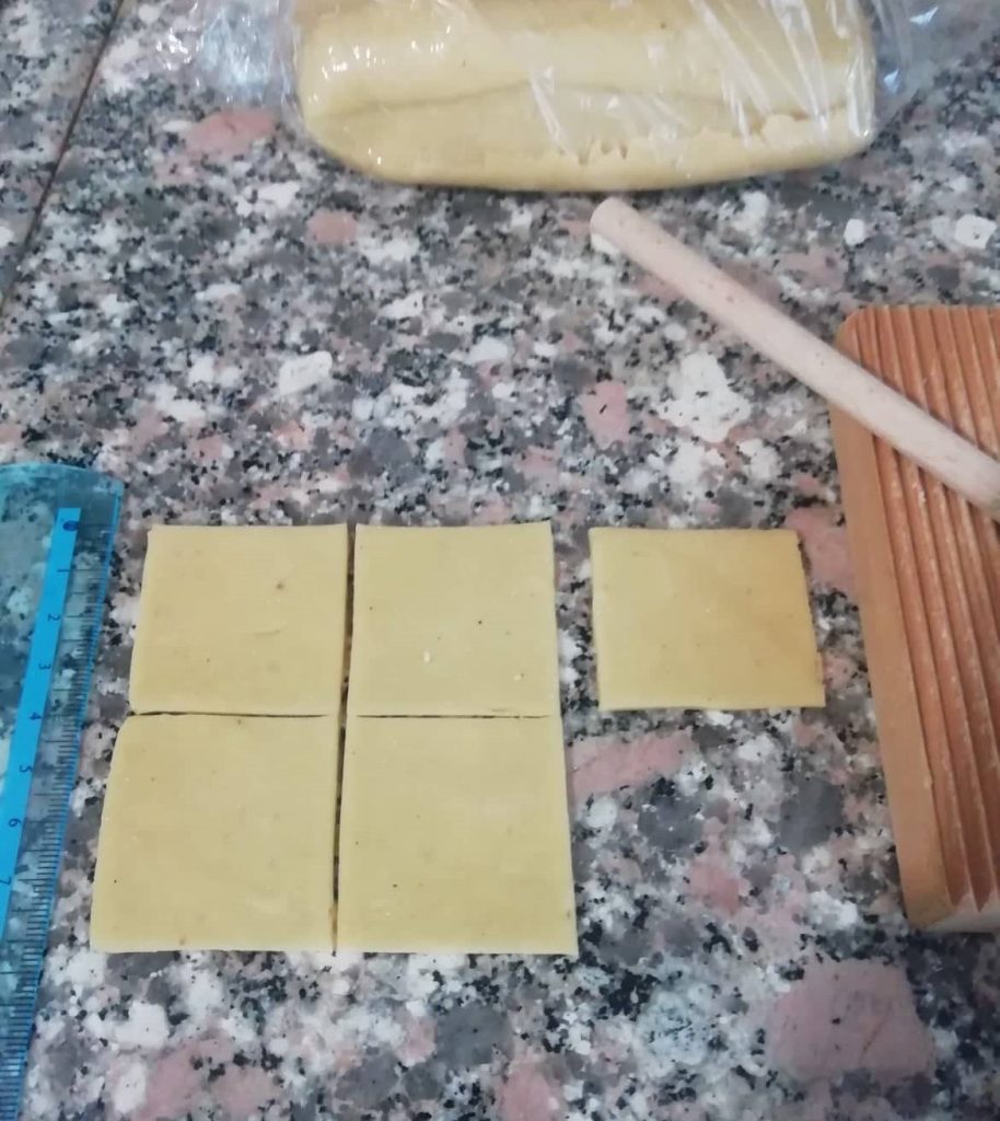 • Con el rodillo, o con la ayuda de la máquina de pasta manual, estira la masa bastante fina. Corta cuadrados de 3 o 4 cm de ancho.