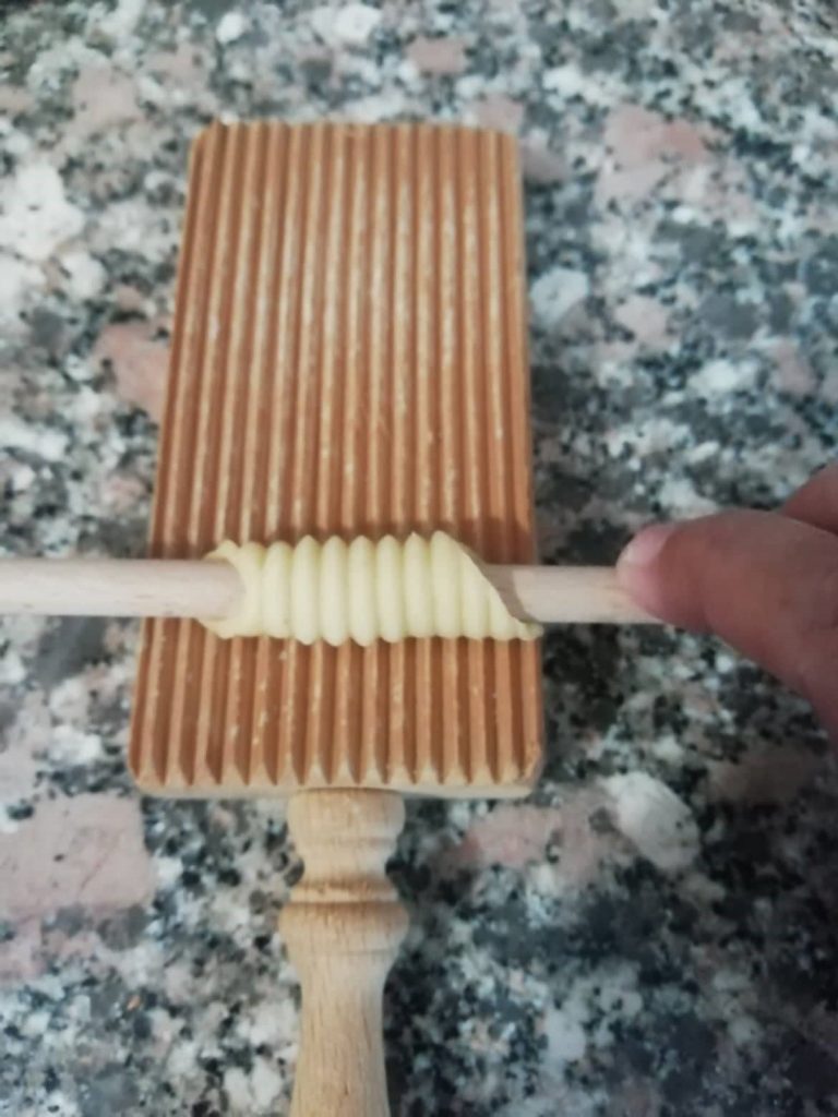 Para dar forma a los garganelli basta con enrollar el rombo de pasta al huevo en un palito de madera adecuado y luego hacerlos girar en una pequeña tabla rayada llamada peine o rizador de ñoquis, para conferir al pasta la característica rayadura.