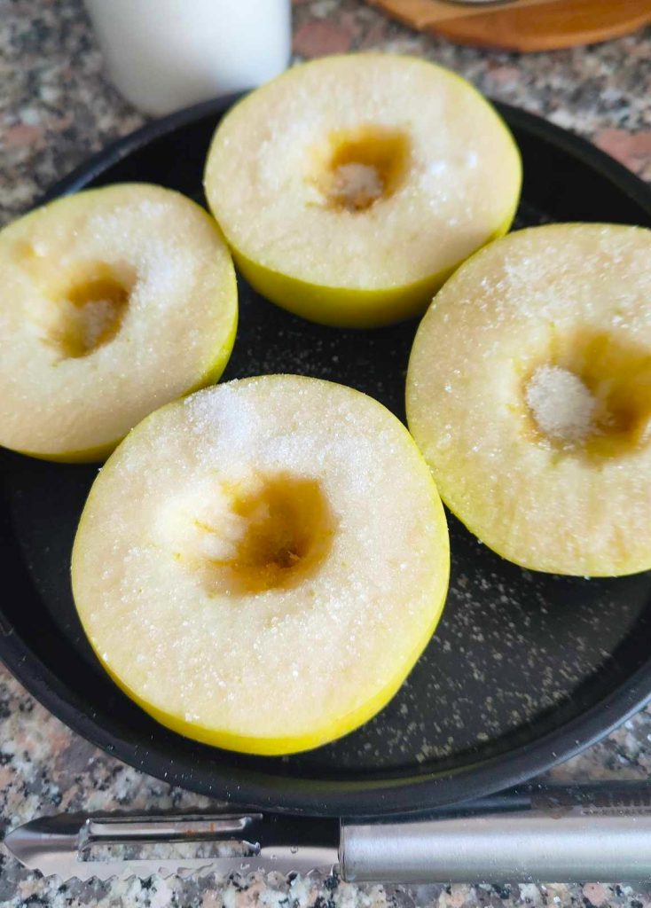 Coloca las manzanas en una bandeja rectangular o redonda de 20×20, adecuada para tu freidora de aire y espolvoréalas con un poco de azúcar.