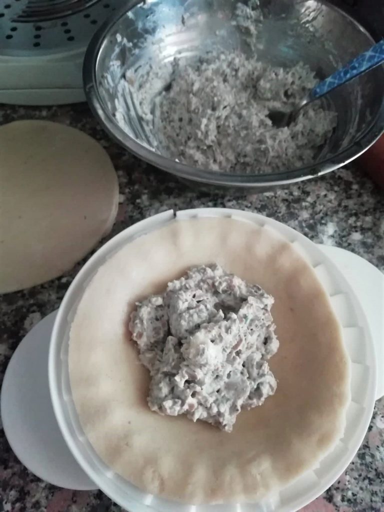 Con un cortapastas de 15 centímetros de diámetro saca los discos. Yo usé el molde mediano para calzones, puse el disco sobre el molde, con un pincel humedecí los bordes y en el centro puse 3 cucharaditas de relleno.