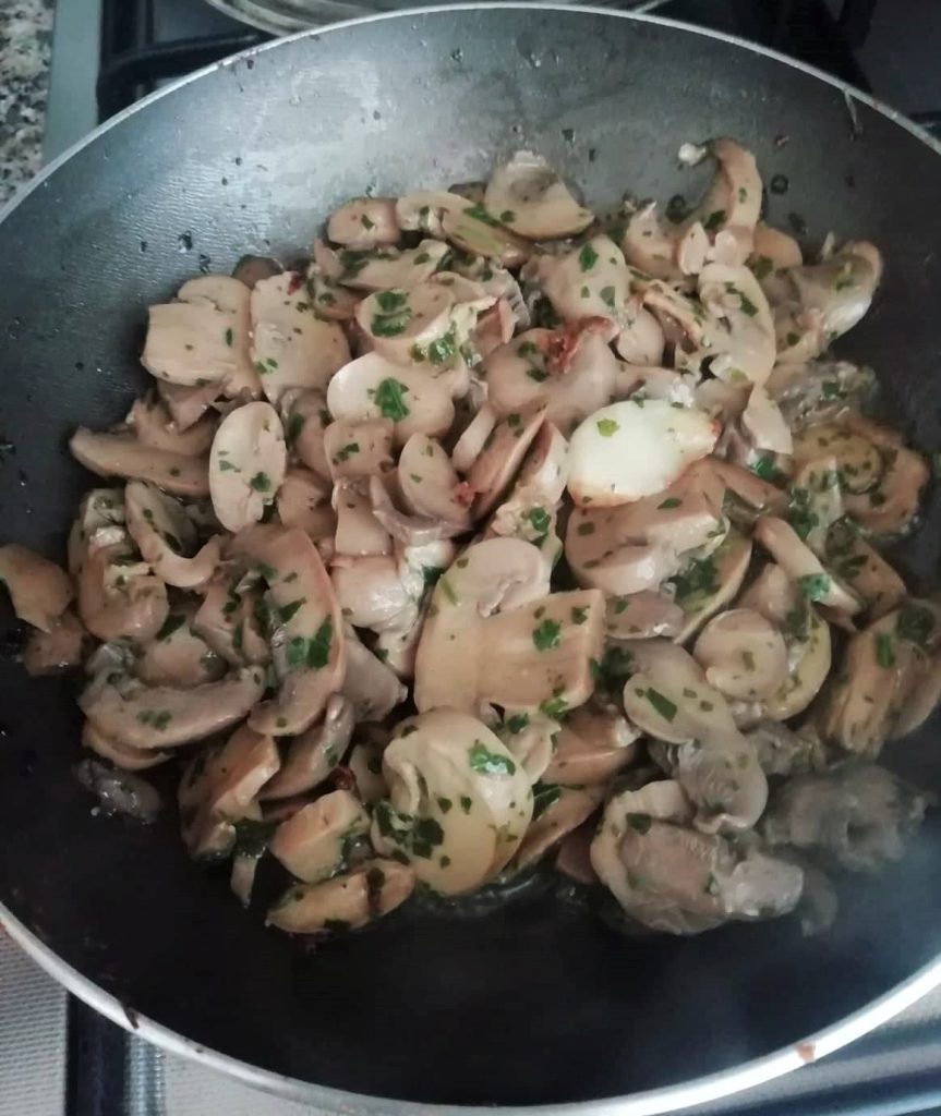 Limpia los champiñones, córtalos en láminas y cocínalos en una sartén con aceite de oliva, un diente de ajo, sal y perejil. Déjalos enfriar escurrir el exceso de agua de cocción y luego pícalos grueso. Añade a los champiñones la ricotta, el parmesano rallado, sal y pimienta y deja a un lado la mezcla del relleno.