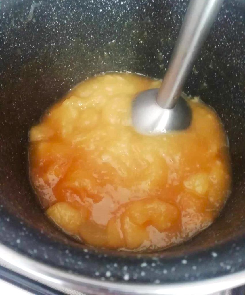 Ahora, con una batidora de inmersión, tritura la fruta hasta obtener un puré liso y homogéneo.