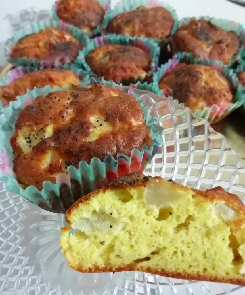 No he usado nueces, pero si quieres, puedes poner media nuez encima del muffin antes de hornearlo, sin embargo he añadido un poco de cúrcuma a la masa y una pizca de semillas de amapola antes de hornearlos. El gorgonzola es dulce, pero también puedes usar el picante, las peras Coscia o Abate son perfectas y con moldes grandes de 5 cm de diámetro obtendrás porciones individuales adecuadas.