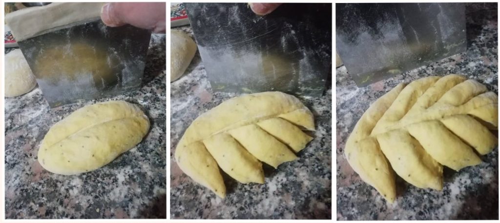 En este punto, podéis comenzar a dar forma a las espigas. Siempre con la espátula cortadora de masa, haced un corte en el centro, sin llegar al fondo (figura 1), luego haced cuatro cortes de un lado (figura 2) y terminad con otros cuatro cortes del otro lado (figura 3).