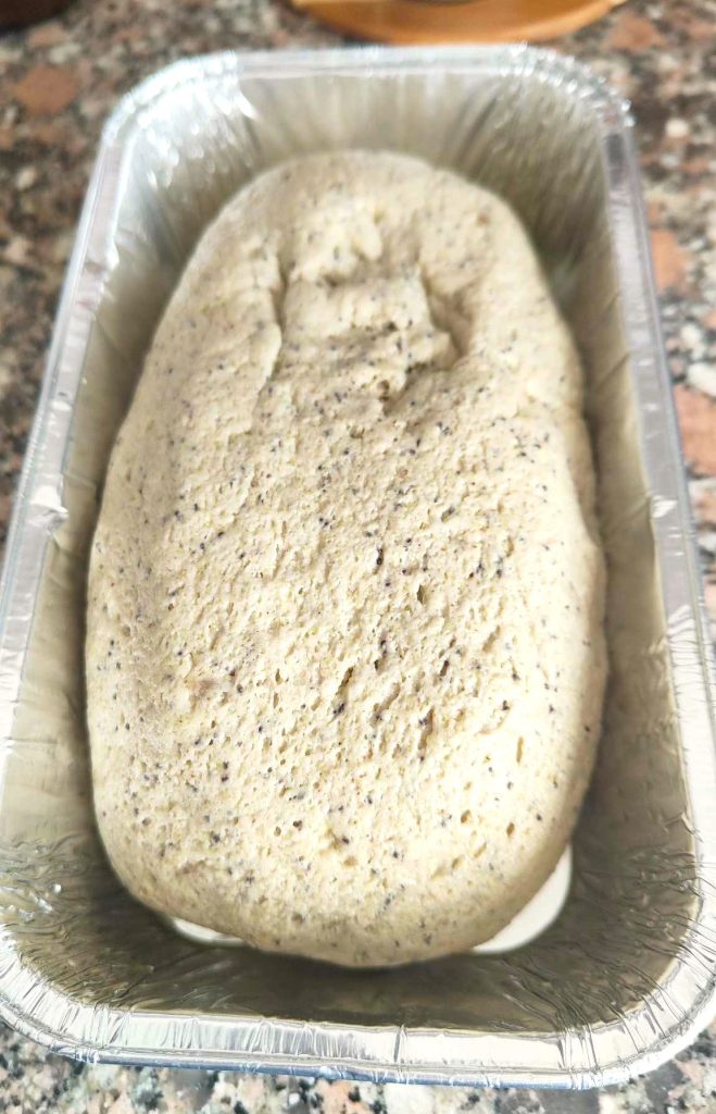 Transcurrido el tiempo de reposo, voltea la masa directamente sobre la mesa de trabajo, sin manipularla, dale forma rectangular al pan y colócalo en un molde rectangular de aluminio engrasado, del tamaño que quepa en tu freidora de aire. Yo uso los de 20 cm x 12 cm.