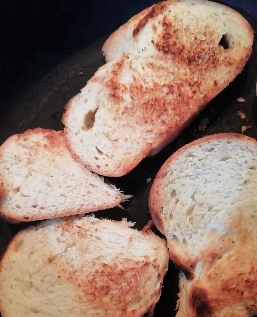 3 – Mientras tanto, tuesta las rebanadas de pan en una sartén, si no tienes pan ya duro.