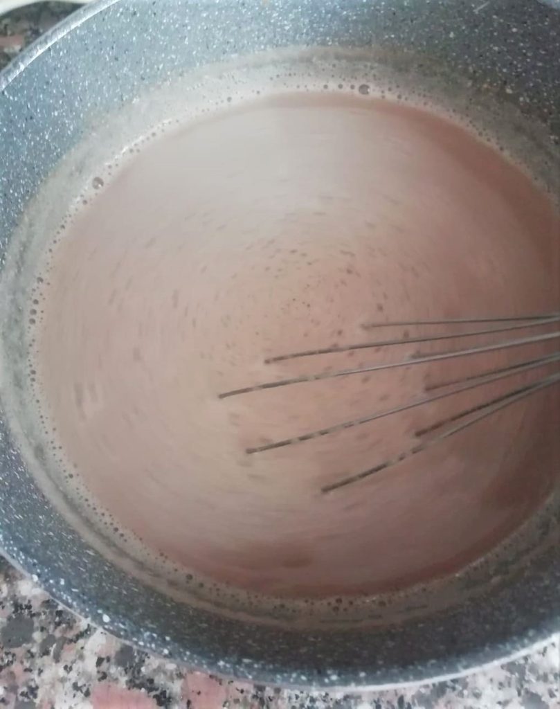 Añade al café con leche el azúcar y pon el cazo al fuego a fuego lento. Cuando empiece a hervir, añade el agar agar que has disuelto por separado y mezcla con una varilla durante 1 minuto. Apaga el fuego y deja que se temple un poco.