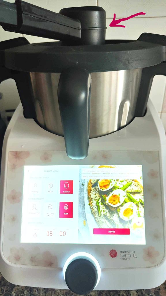 Pero, si lo tienes, te recomiendo que pongas el desviador de vapor en lugar del medidor. Un accesorio muy útil durante las cocciones al vapor o para altas temperaturas, especialmente si nuestro robot se encuentra posicionado debajo de los armarios de la cocina. (ver flecha)
