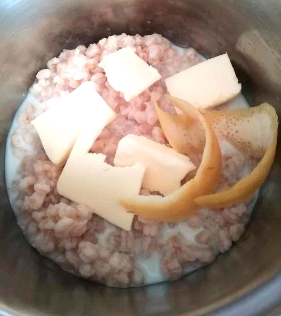 Comenzad a preparar el trigo, que ya se encuentra cocido en tarros de vidrio. Colocadlo en una cacerola con la leche, la mantequilla, la cáscara de limón entera y cocedlo a fuego bajo hasta que se convierta en una crema.