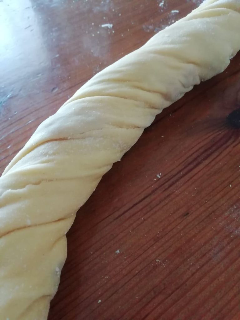 • Después de haber enrollado la masa hojaldrada, enrósquenla en forma de espiral, como un caracol.