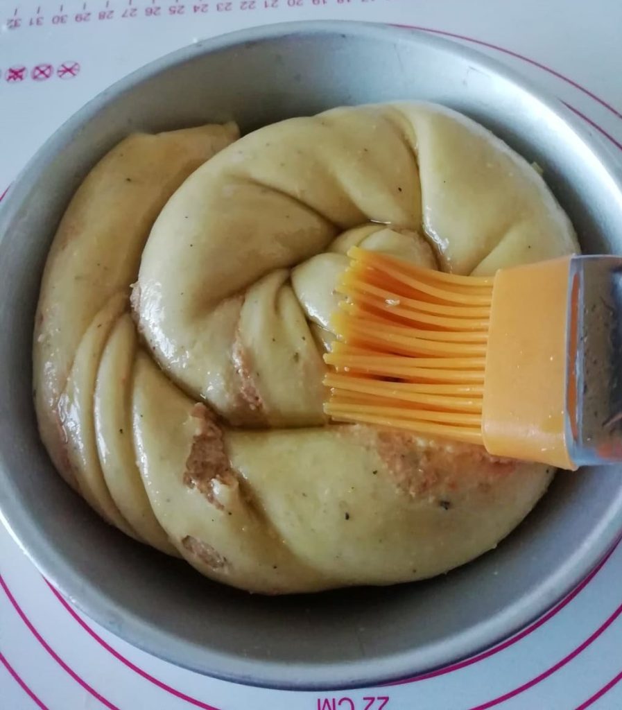 Engrasen con aceite un molde que la contenga, en este caso de 20 centímetros de diámetro, y colóquenla dentro terminando con una pincelada de aceite de oliva. Pueden decorarla con una espolvoreada de semillas de sésamo y de amapola.