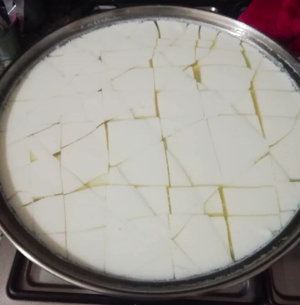 Con un cuchillo largo de hoja lisa corta la cuajada en cubos medianos, llegando hasta el fondo de la olla.
