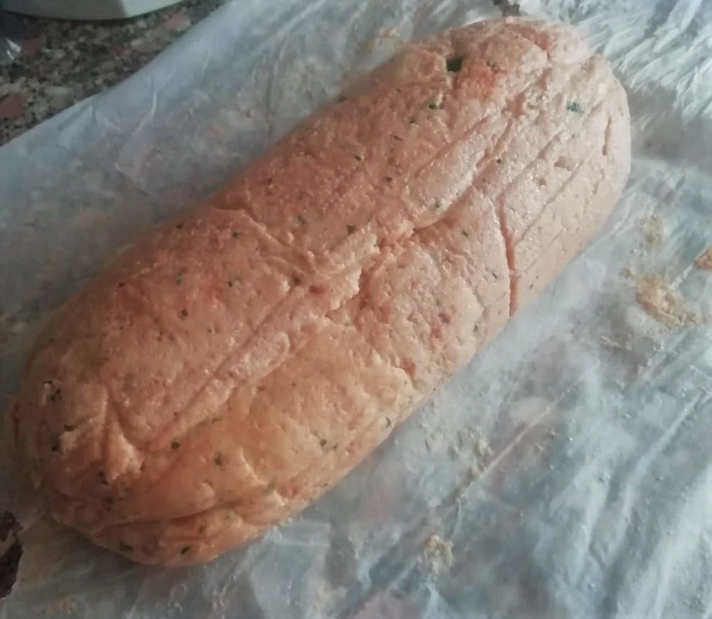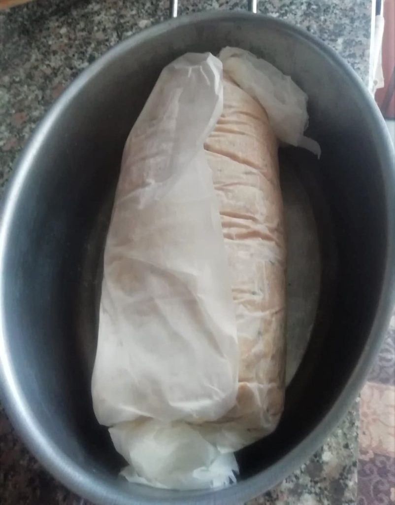 Cerrad el rollo de pan en la hoja de papel de horno y colocadlo en una fuente que lo contenga.