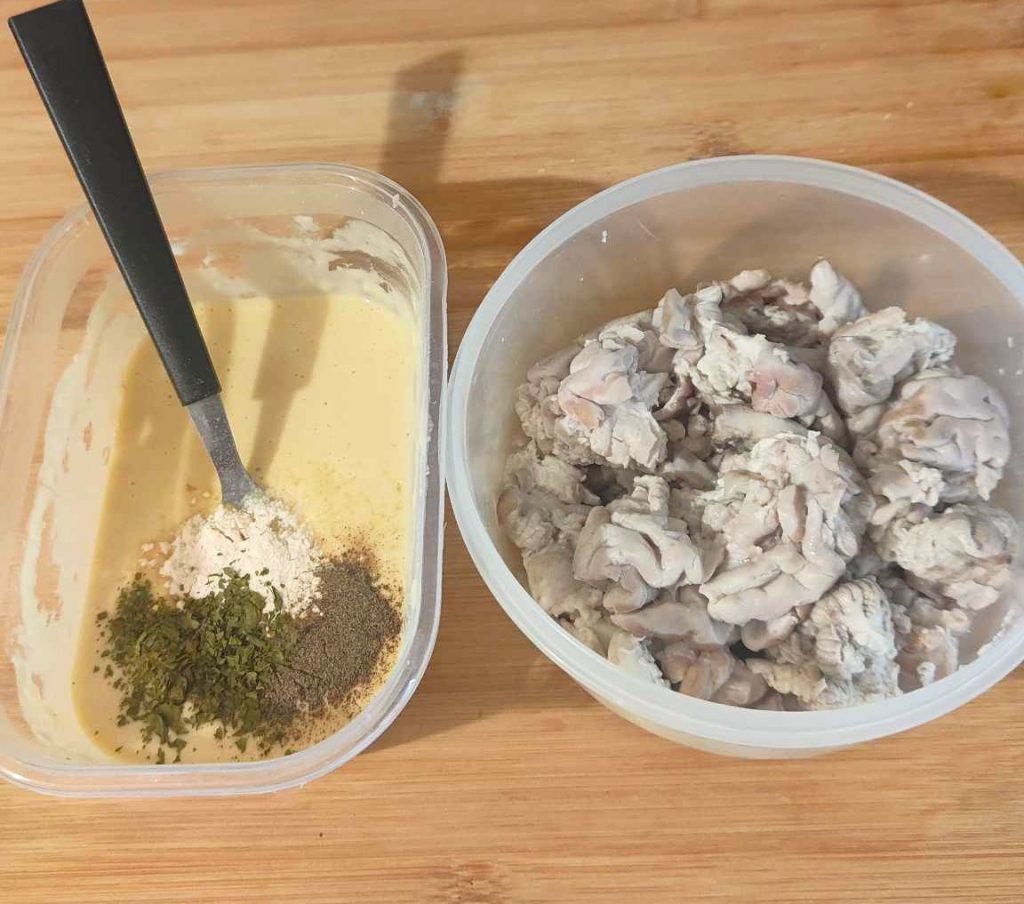 4 – En un bol pequeño bata el huevo con la harina, la sal y los aromas, ajo en polvo y perejil. Vierta la mezcla en el bol de los sesos y mezcle la masa con suavidad.