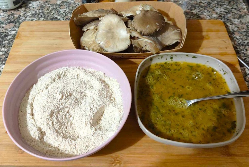 Pasa una a una las setas en la mezcla de pan rallado y harina y luego en el huevo batido.