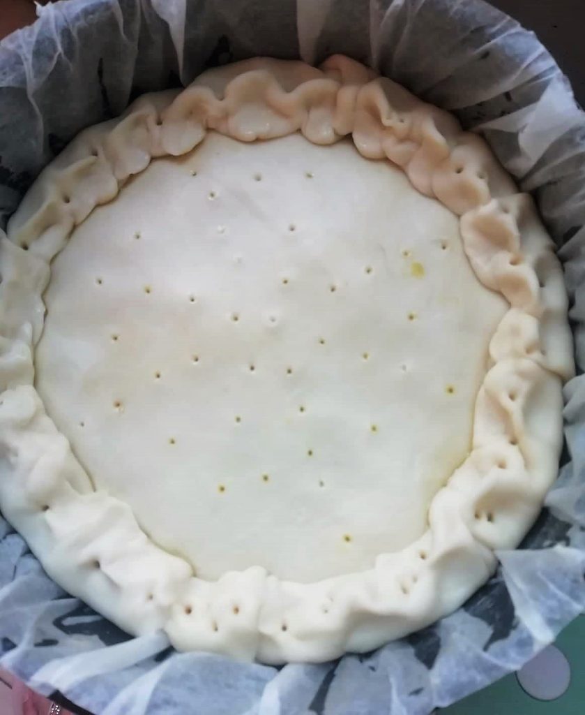 Desenrollad una lámina de masa de hojaldre y colocadla con todo su papel de horno en la fuente. Hacedla adherir al fondo y a las paredes y luego recortad el exceso de masa que sobresalga del borde.