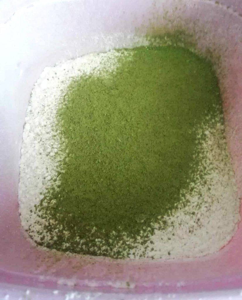 Tamiza la harina y el té Matcha juntos, luego mezcla los polvos.