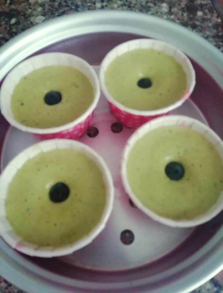 Dentro de cada cápsula vierte 3 cucharadas de la mezcla, dejando al menos 1 cm del borde. Coloca en el centro una baya de arándano negro y colócalas en la vaporera, una al lado de la otra.