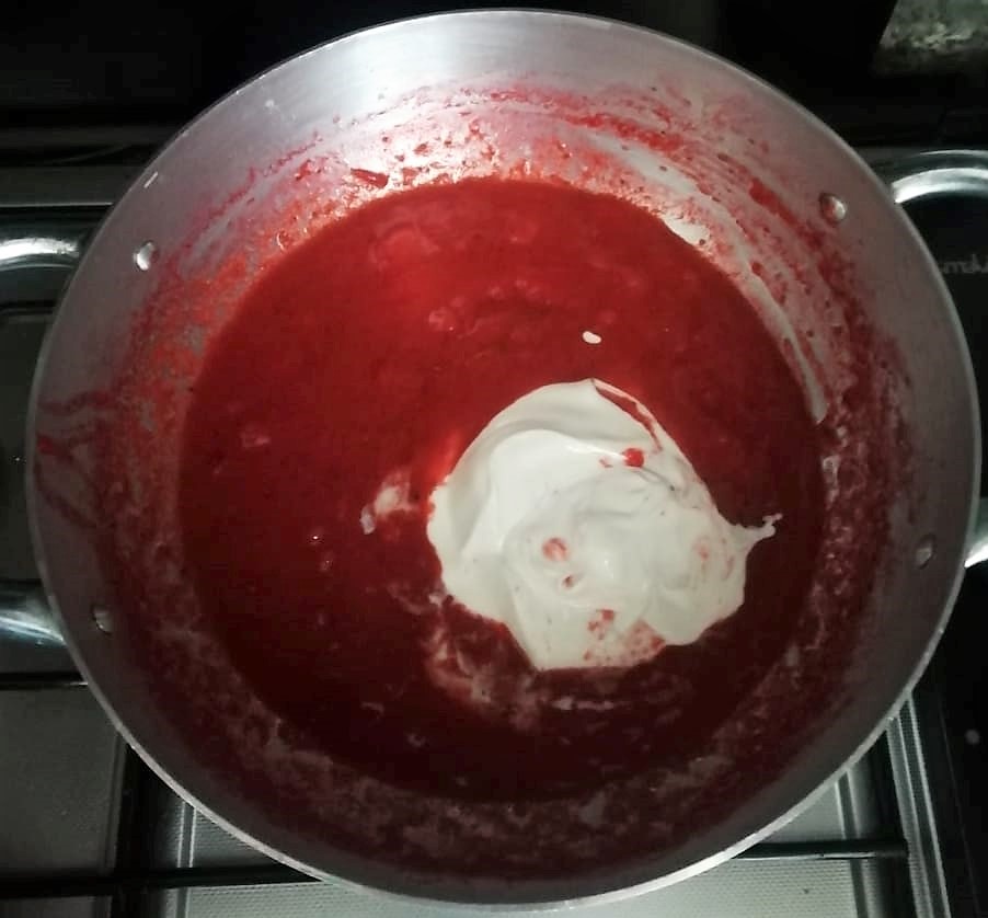 Antes de escurrir las trofie, añade sal y pimienta a la salsa de fresas, vierte la nata y mezcla.