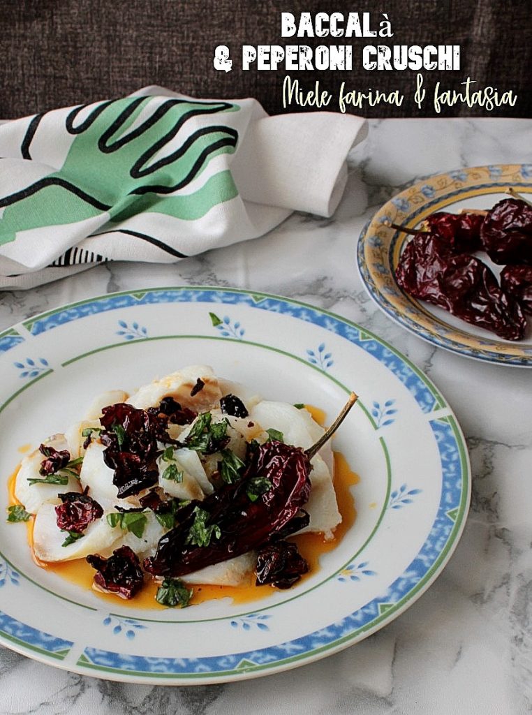 El bacalao y pimientos crujientes (o «bacalao a la marinera» o bacalao a la potentina) es un sabroso segundo plato de pescado muy fácil y rápido de realizar, una verdadera delicia. Los pimientos crujientes, si no los conoces o nunca los has probado, son pimientos crujientes (cruschi, precisamente), pertenecientes a la tradición gastronómica lucana (pero también los encontramos en la cocina calabresa), reconocidos como PAT, o sea «producto agroalimentario tradicional». Se trata de una variedad de pimientos de sabor dulce, color rojo intenso, pulpa fina y bajo contenido de agua. Todas estas características, especialmente las dos últimas, los hacen perfectos para la deshidratación. Las «coronas» de pimientos deshidratados lucen espléndidas en los balcones o en las tiendas de comestibles, fruterías, y cuando voy a Basilicata, nunca regreso sin una de estas delicias (no es la única, de todos modos). He comido bacalao y pimientos crujientes varias veces en el lugar y hoy quise replicarlo en mi casa, porque es una de esas recetas simples que en realidad esconden un sabor y un aroma que hacen que se te haga la boca agua inmediatamente.