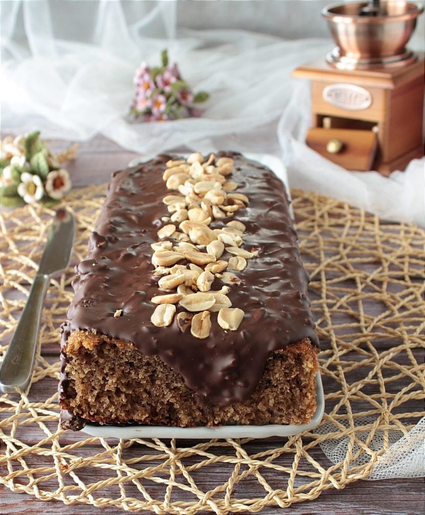 Hoy os propongo este bizcocho de café, muy esponjoso y delicioso, realizado sin añadir leche ni mantequilla a la mezcla, por lo que no contiene lactosa ni proteínas de la leche. Os propondré esta receta en dos versiones, una con harinas tradicionales con gluten y otra sin gluten, para que podáis realizarla como prefiráis, según vuestras necesidades y gustos. Es un dulce muy, muy fácil, perfumado y extraordinariamente esponjoso. Todo se enriquece con una deliciosa cobertura de chocolate negro y cacahuetes no salados que hacen de este bizcocho un auténtico placer.
