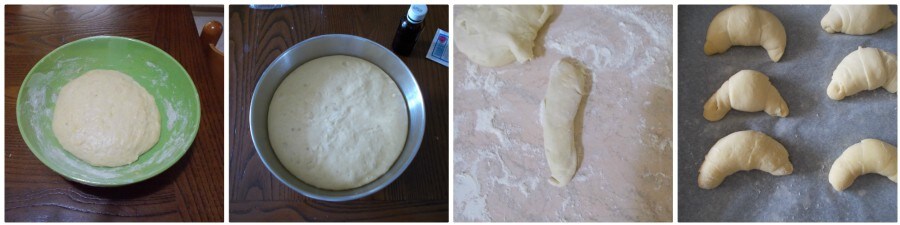 4) Cuando haya fermentado, la volcamos con cuidado sobre una superficie ligeramente enharinada y la dividimos en 6 o más piezas, según nuestras necesidades. Colocamos cada pieza en vertical respecto a nosotros y, empezando desde arriba, la enrollamos sobre sí misma. Al mismo tiempo, tiramos poco a poco de los extremos de la masa hacia afuera. De esta manera se formará un croissant o brioche, como se quiera llamar.