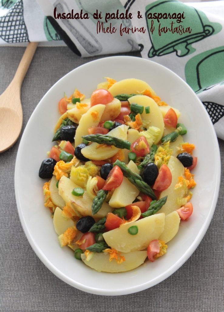Hoy hablamos de un plato típicamente veraniego, la ensalada de patatas, enriquecida con espárragos y flores de calabacín, a la que podemos añadir muchos otros ingredientes, según nuestros gustos y lo que ya tengamos en la despensa y en la nevera. Es una receta muy práctica, ya que se puede preparar con mucha anticipación; además, es versátil, facilísima, rica, colorida, vegetariana o no, para disfrutar en casa, en el trabajo o en el tiempo libre, según nuestras necesidades.
