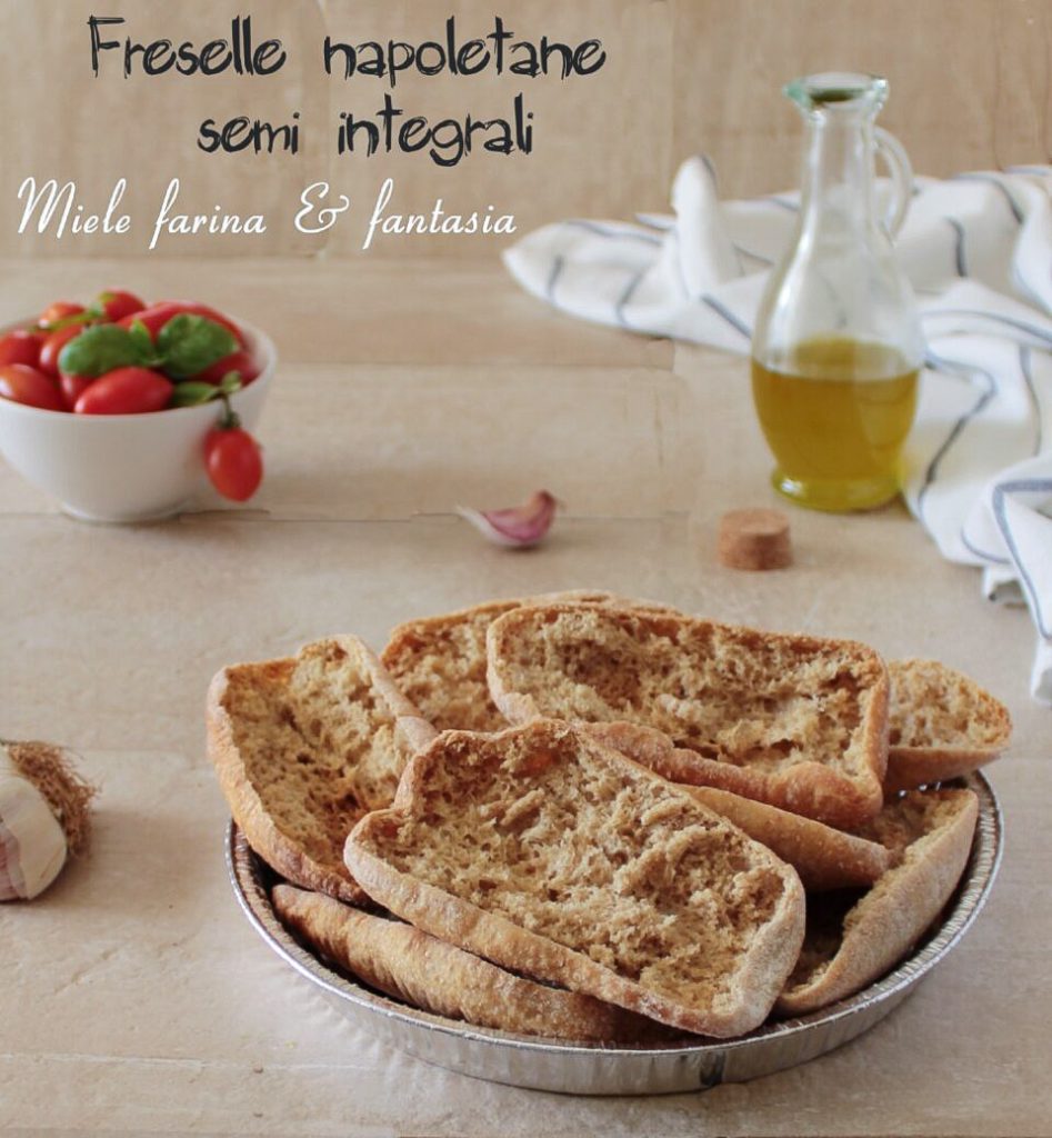 ¿Alguna vez has probado las típicas freselle napolitanas? Las freselle se hacen con la masa del pan y, una vez cocidas, los bollitos se cortan en dos, se vuelven a meter en el horno y se tuestan. De este modo se conservarán durante mucho tiempo y, para disfrutarlas, será suficiente mojarlas con agua o salsas, para que vuelvan a estar blandas. Están buenísimas también al natural, crujientes. Son excelentes para el almuerzo, la cena o para un tentempié rápido. Hoy hablamos de las freselle preparadas con harina integral y sémola de trigo duro remolida. Pueden tener formas y tamaños diferentes: redondas en forma de rosquilla, cuadradas o largas en forma de rombo. Es un alimento que no contiene grasas, por lo que es apto para todos. Las freselle, generalmente, se disfrutan mojadas con caldo de pulpo o de mejillones y almejas, de legumbres, pero el plato al que la fresella está ligada de manera indisoluble es la «caponata» napolitana. La caponata es un plato único, a base de tomates, aceite, sal y alguna anchoa, que se sirve exclusivamente sobre las freselle. La receta de la que os hablo hoy es la de mi suegra. Una receta antigua, muy sencilla, realizada con masa madre.