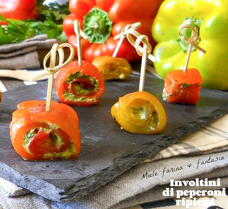 Los rollitos de pimientos rellenos de anchoas y pesto de perejil son muy sabrosos, deliciosos, vistosos, un excelente finger food para servir como guarnición para carne o pescado; o para enriquecer un buffet, un entrante, sándwiches, etc… Son realmente fáciles y se pueden personalizar como más nos guste; por ejemplo, si deseamos una preparación completamente vegetariana eliminaremos las anchoas de la preparación. Son muy prácticos y perfectos si tenemos pimientos para consumir. Los pimientos no han sido asados, sino horneados y luego pelados con el método de la bolsa para alimentos; de hecho, la piel se ha desprendido fácilmente.
