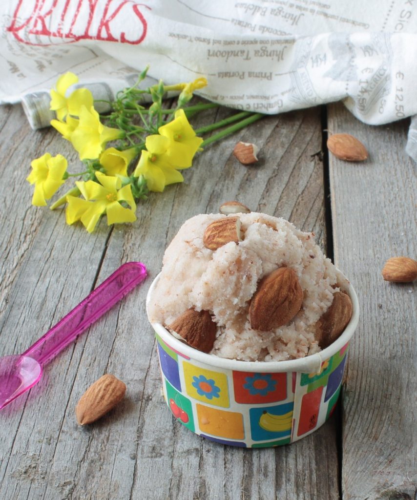 Las almendras forman parte de la categoría denominada «frutos secos», son muy versátiles, buenísimas, y se prestan a ser protagonistas en innumerables preparaciones tanto dulces como saladas. Hoy las he convertido en protagonistas de este delicioso sorbete, muy fácil, que no necesita una heladera, no contiene huevos, ni gluten o derivados lácteos. Podemos proponerlo al final de una comida como un postre de cuchara o simplemente disfrutarlo cuando tenemos ganas de algo dulce y aromático. A diferencia de los sorbetes o helados industriales, el sorbete de almendras hecho en casa contiene solo los ingredientes que lees en la lista y nada más; no hay otros elementos para hacerlo más cremoso o para evitar que se congele demasiado. Esto significa que será más duro y compacto, pero bastará con dejarlo a temperatura ambiente de 5 a 10 minutos antes de servirlo.
