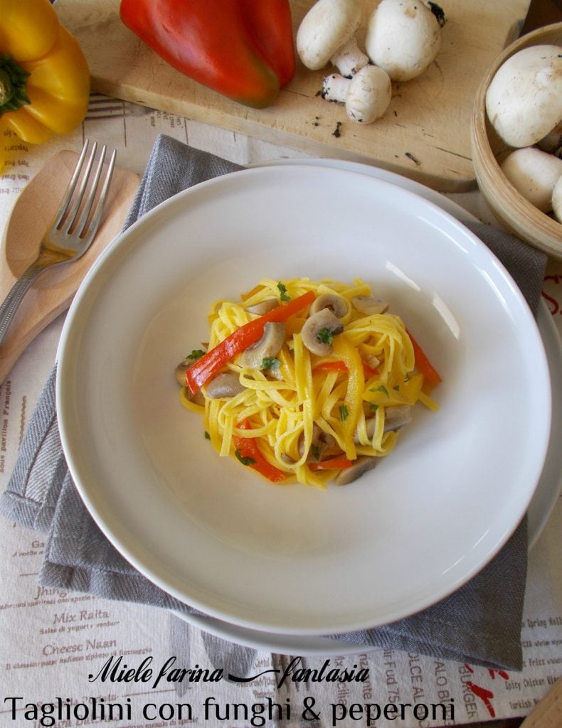 Tagliolini al huevo con setas y pimientos, un plato sencillo, colorido, aromático y muy sabroso que se prepara en poco tiempo y que podemos realizar para invitados imprevistos o para el almuerzo del domingo, consumiendo, de esta manera, verduras y hortalizas de forma sencilla y sabrosa. Es una receta vegetariana pero que puede ser enriquecida con otros ingredientes a nuestra elección, transformándola en un plato único completo. Si queréis probar con la pasta fresca al huevo, aquí tenéis una guía fácil para realizarla con vuestras manos, de forma sencilla y con éxito.
