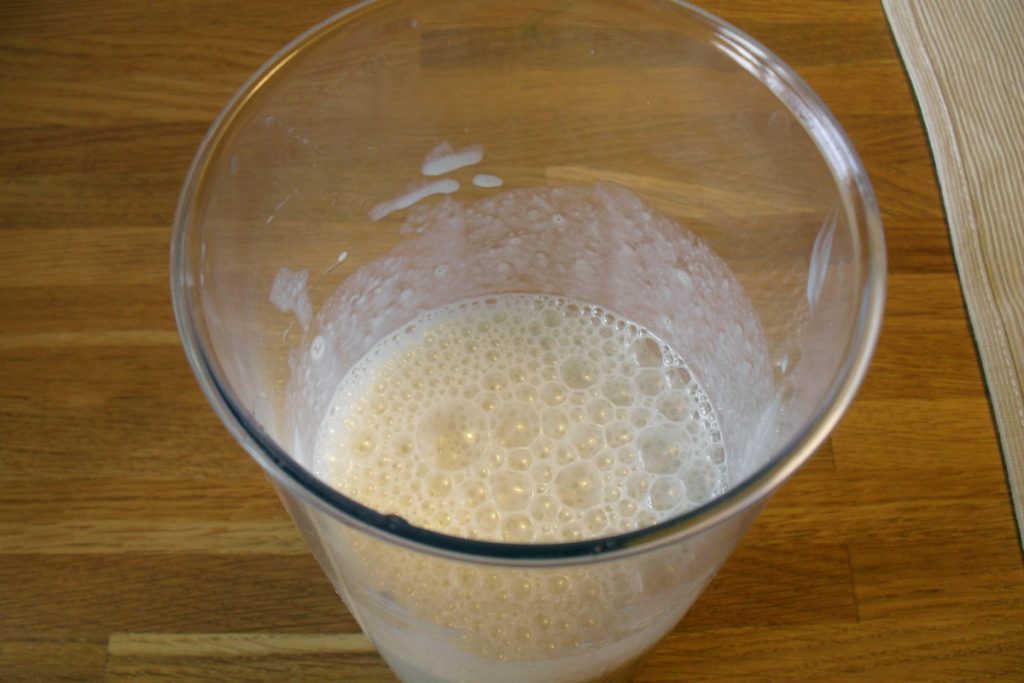 Añade la leche y el jarabe de agave y sigue batiendo hasta que esté bien aireado.