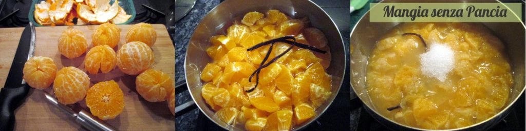Pela las mandarinas, elimina las posibles semillas y corta todos los gajos en trozos pequeños. Ponlos en una olla grande y cubre apenas con agua. Añade la vaina de vainilla abierta por la mitad a lo largo, cubre y pon a hervir. Luego continúa cocinando a fuego bajo por media hora removiendo de vez en cuando, luego añade el azúcar y mezcla bien. Cubre de nuevo y cocina a fuego bajo por otra media hora.