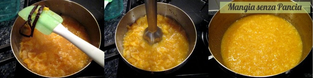 Retira la vaina de vainilla y usa la batidora de mano para triturar la compota sin hacerla puré: bastará usar la batidora pulsando por unos segundos girando la batidora en la olla. Si la compota está demasiado líquida, déjala hervir suavemente por un cuarto de hora más o hasta que tenga la consistencia deseada. Yo la dejé bastante húmeda y obtengo unos 400 gramos en total.