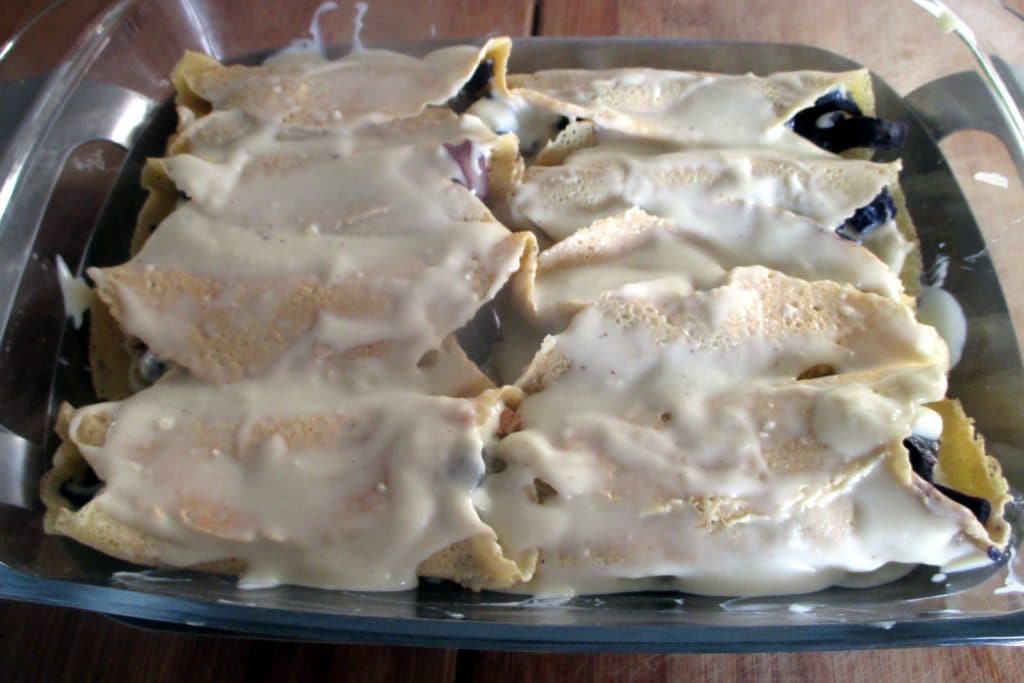 • Enrolla cuidadosamente cada crepe y colócalas en la bandeja para que queden pegadas una a la otra.