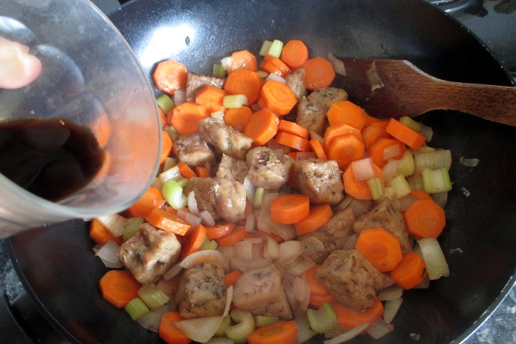 • Retira el seitán de la cacerola y por ahora resérvalo. Añade otra cucharadita de aceite y dora la cebolla, las zanahorias y el apio, ayudándote con un poco de agua o caldo si se seca demasiado.