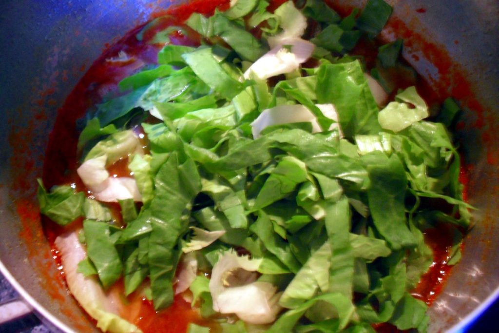 Cuando la escarola esté toda marchita, apaga el fuego, añade algunas hojas más de albahaca y ajusta la sal.