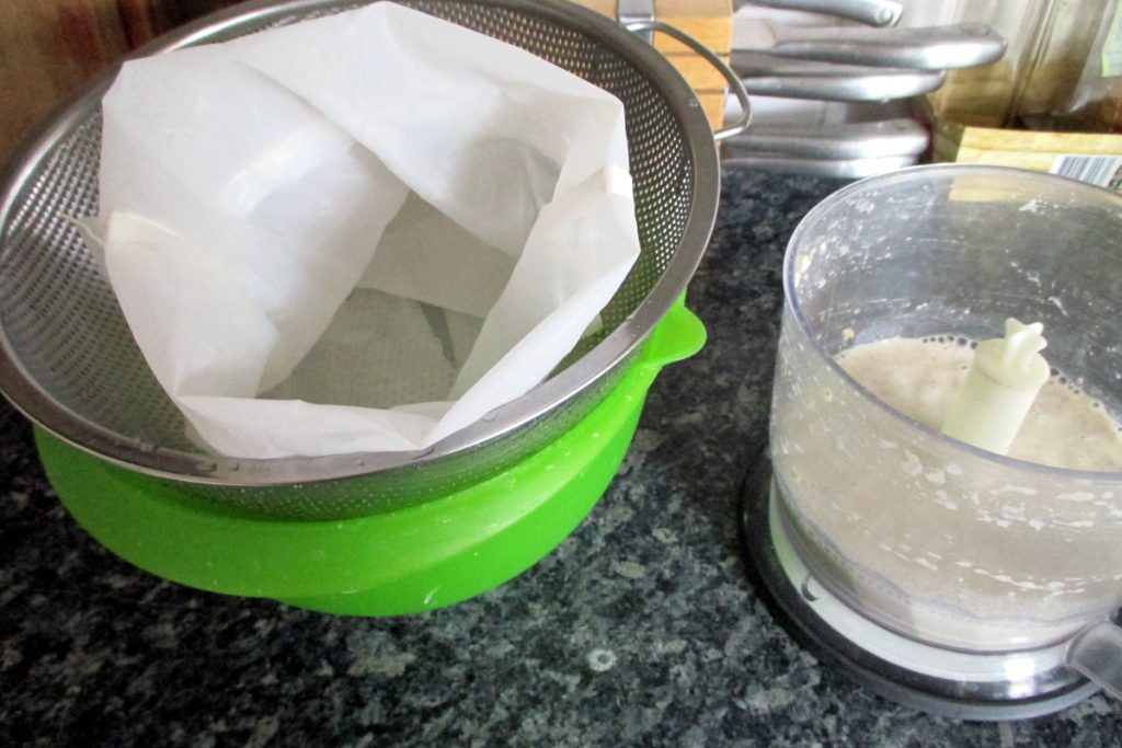 • Prepara un bol con el colador y coloca sobre él una bolsa específica para filtrar leches vegetales. Como alternativa puedes usar un paño de cocina limpio y sin perfume.