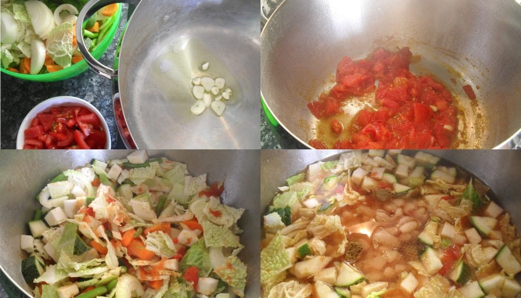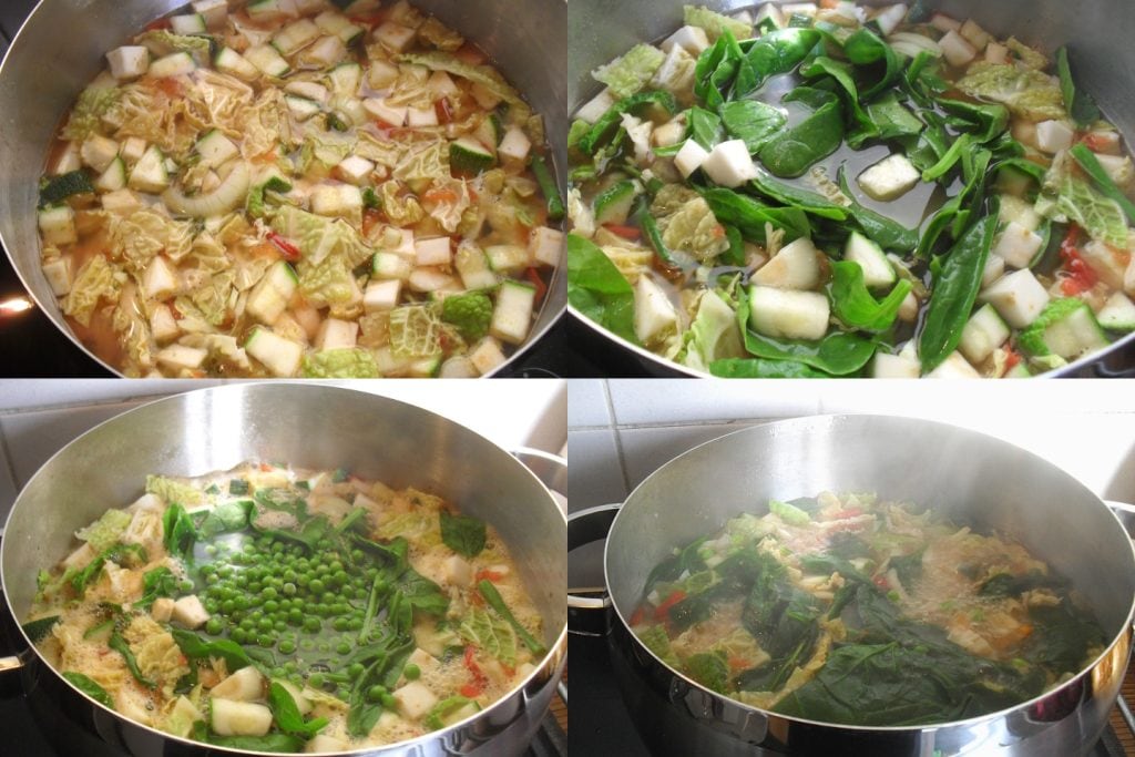 Sofríe el ajo cortado en láminas en la cucharadita de aceite y apenas empiece a dorarse añade los tomates cortados en cubos. Cocina por unos minutos mezclando, luego añade todas las verduras excepto las espinacas y los guisantes congelados si los usas. Mezcla bien y cubre con agua. Añade el caldo vegetal en trozos o un par de cucharaditas del granulado. Mezcla bien, tapa y cocina a fuego lento durante media hora.